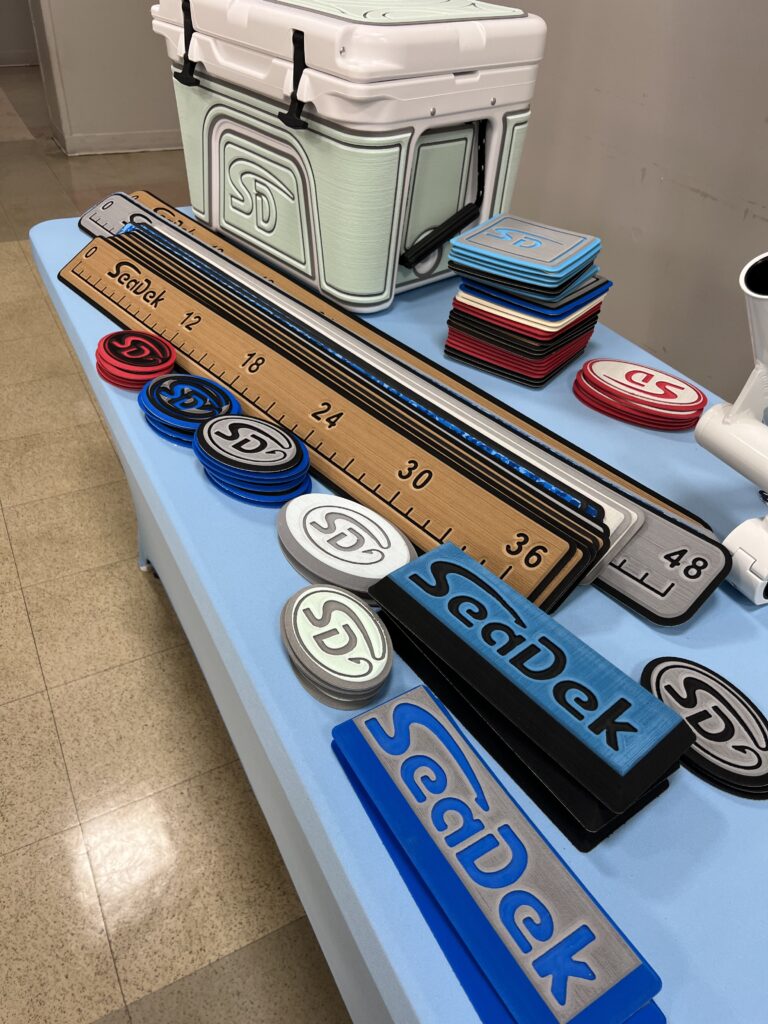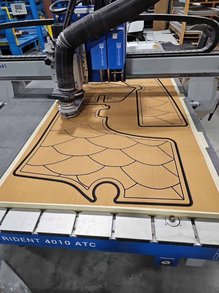 Once the design is approved, our SeaDek Mid-Atlantic team in New Bern, North Carolina, will begin fabrication using state-of-the-art CNC cutting technology, CNC stands for Computer Numerical Control, meaning the machine’s movements are guided by software and code, allowing for high precision, speed, and repeatability in creating complex shapes and detailed designs. This ensures your custom SeaDek product is produced with precision. Custom colors will be ordered specifically for your project, with a typical lead-time of four weeks.